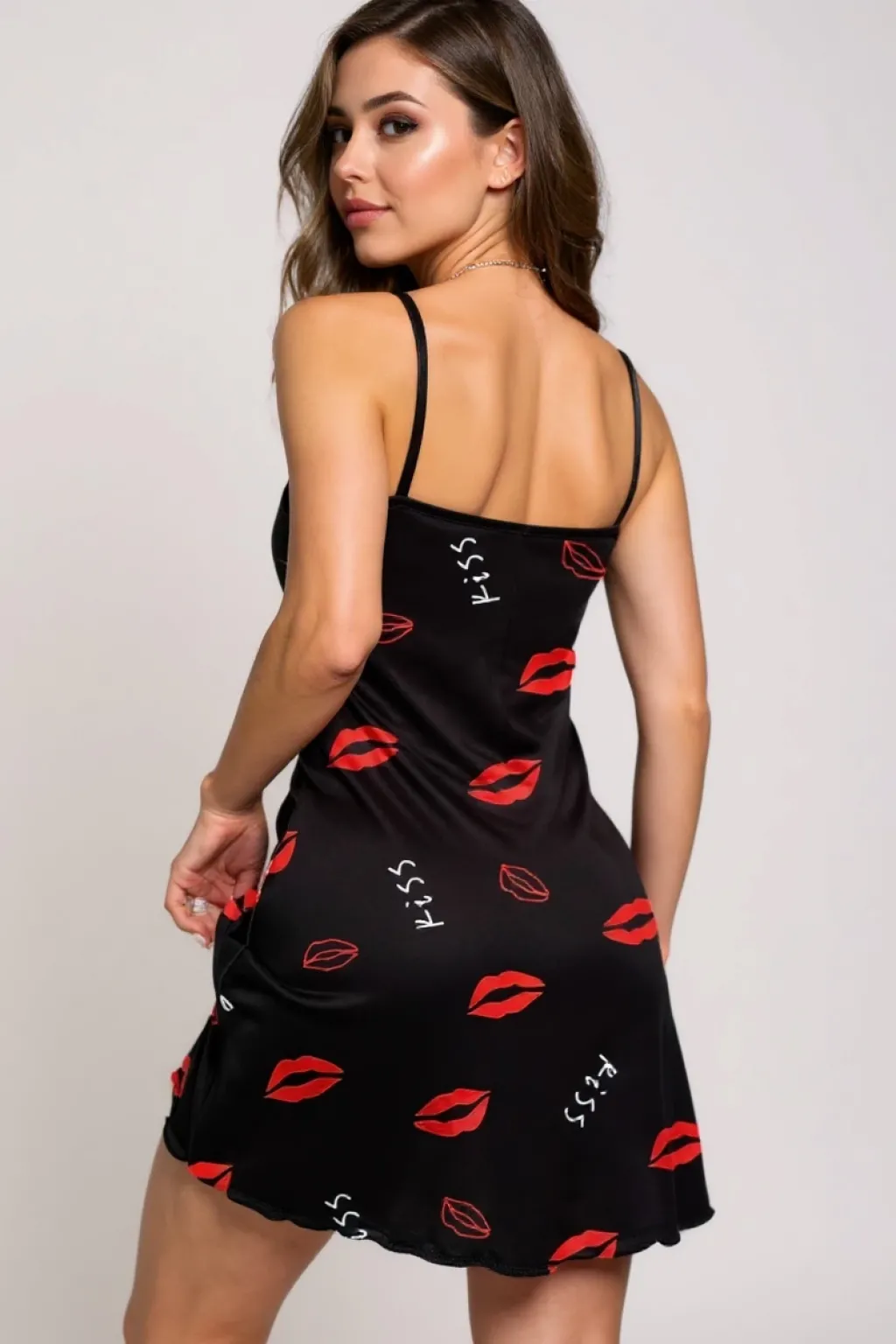 Aşk Temalı Kalp Desenli Siyah Saten Gecelik
