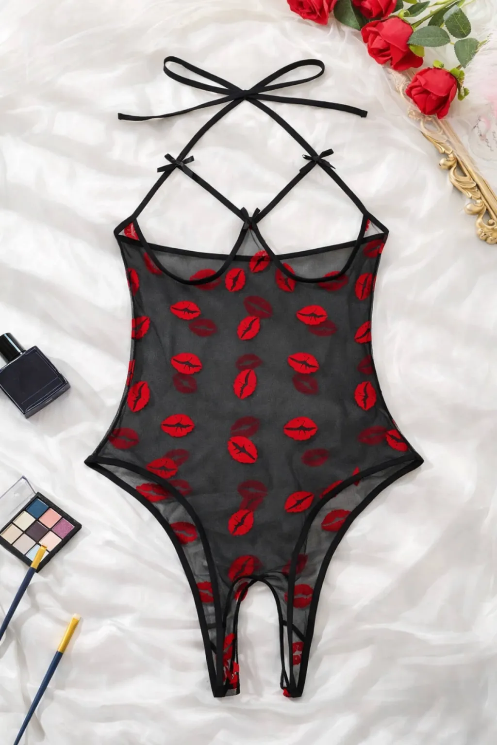 Özel tasarım dudak desenli fantazi body; romantik, cesur ve dikkat çekici iç giyim seven kadınlar için idealdir.