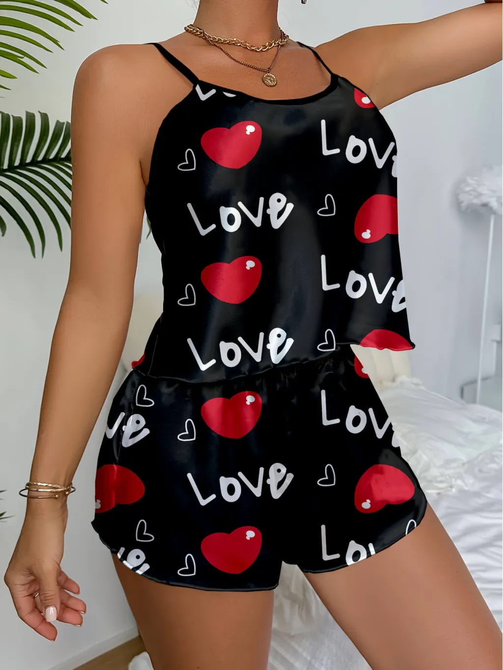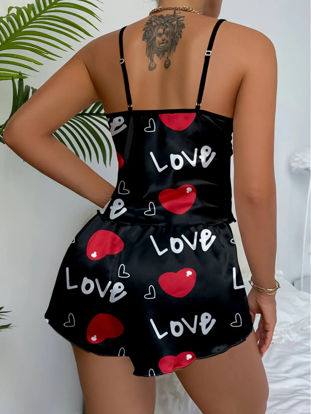 Aşk Temalı Kalp Desenli Siyah Saten Şortlu Gecelik Takım