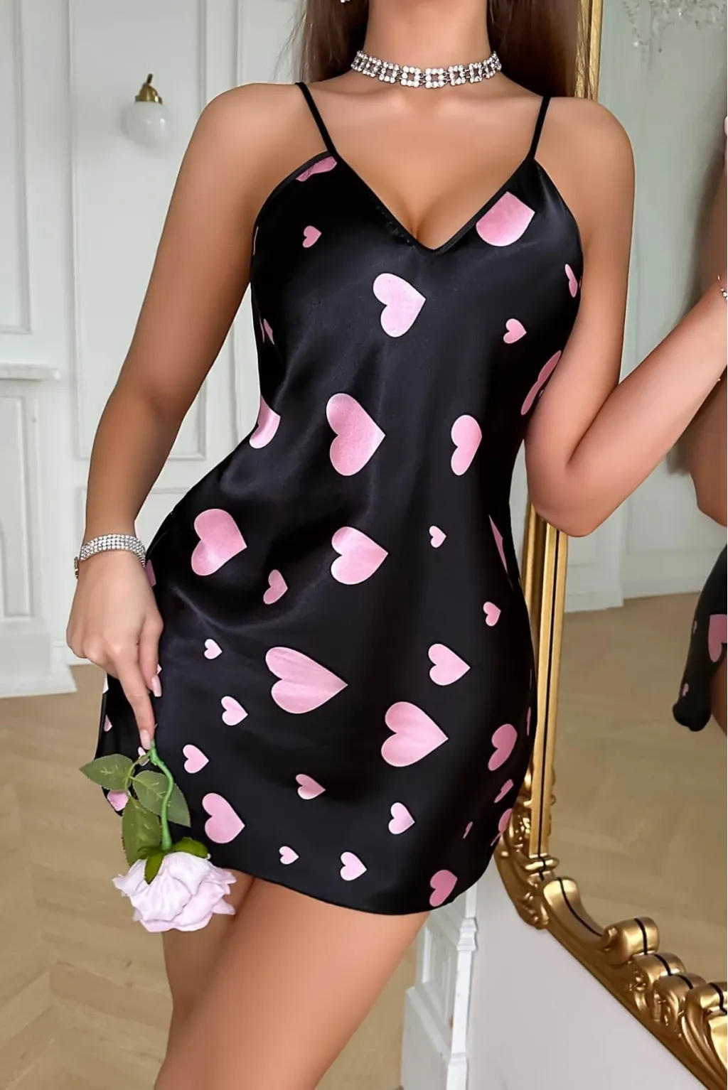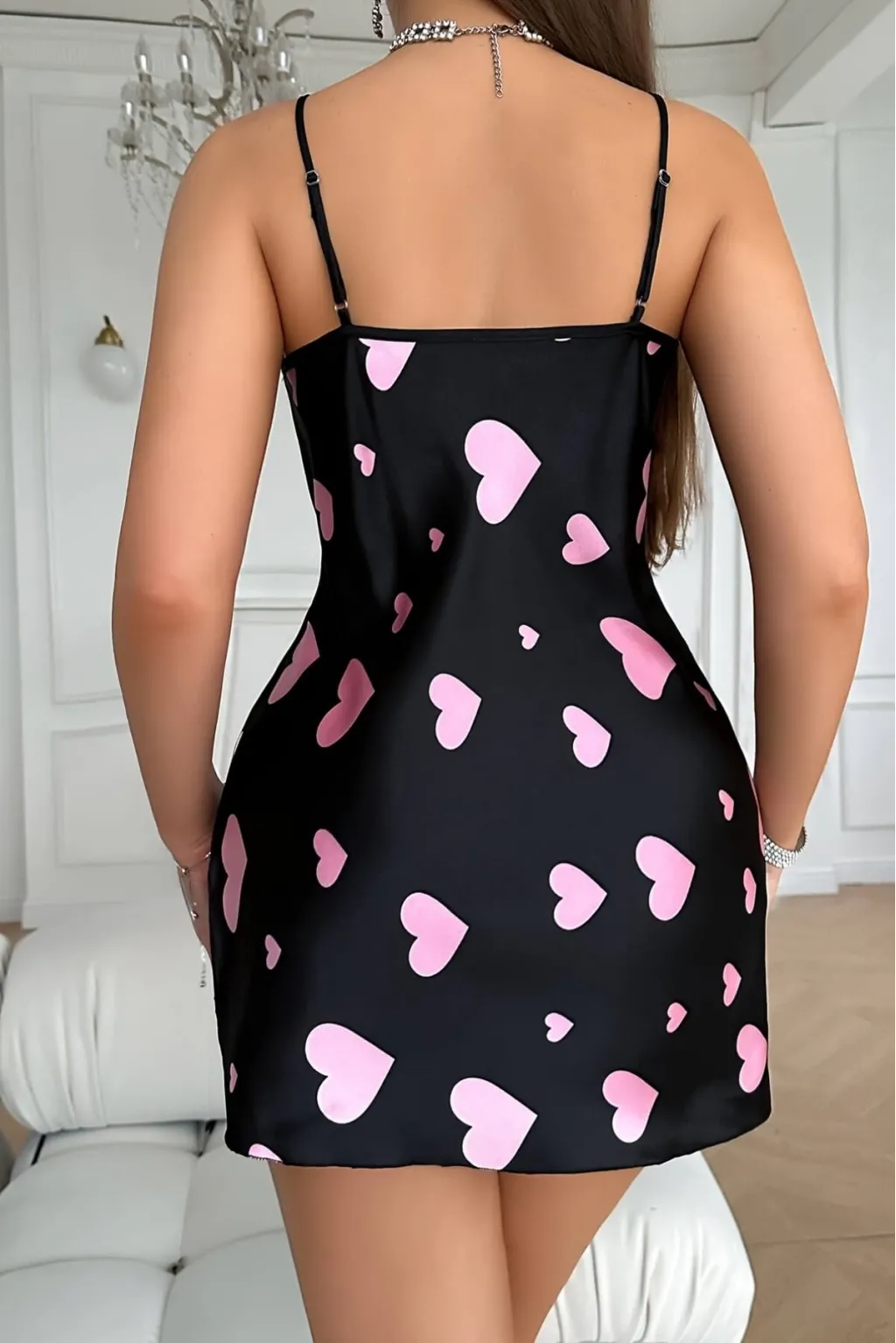 Pembe Kalp Desenli Siyah Saten Gecelik